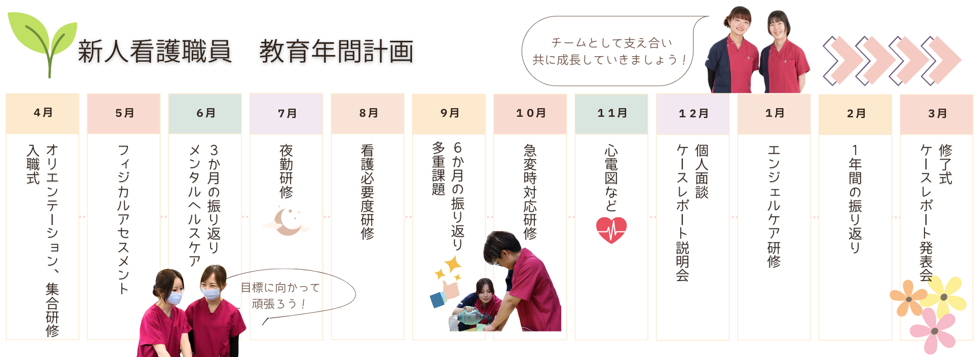 すべての研修部門先ではプリセプターシップをとりながら、看護実践能力の基礎を積み上げられる様に支援計画書に基づきサポートしていきます。