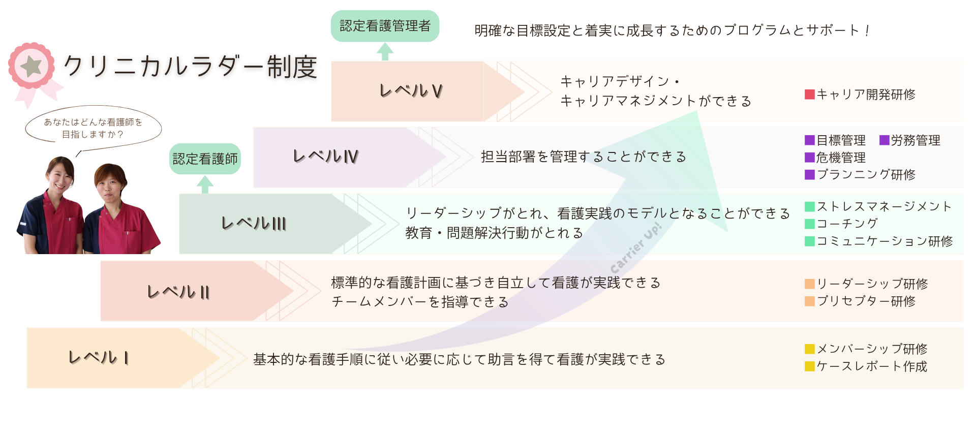 クリニカルラダーを基盤としながら、効率のよい教育と自律的な学習環境を実現できるため、柔軟性の高いラダー教育が実現しています。