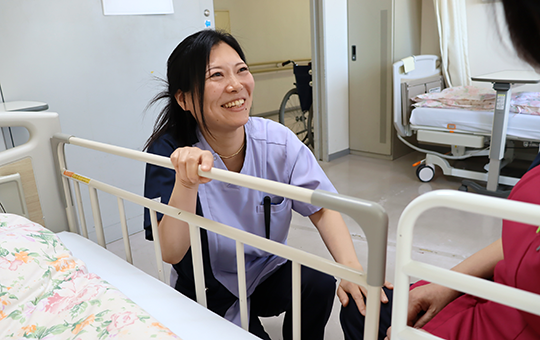 仕事をする上で大事にしていることは、患者様のメンタル面の状態を気遣い、患者様の支えになりたいと思っています。毎日のお仕事は限られた時間の中で忙しくなることも多いですが、一言でもこちらからお声掛けをするように努めています。職員が忙しそうにしていると遠慮してナースコールを押すことをためらう患者様も多いですが「いつでも呼んでくださいね」と声掛けをしています。患者様は入院生活の不安もある中で家族から離れて暮らし、寂しい気持ちをお持ちです。だからこそ、少しでも元気を与えられるようにと思います。
